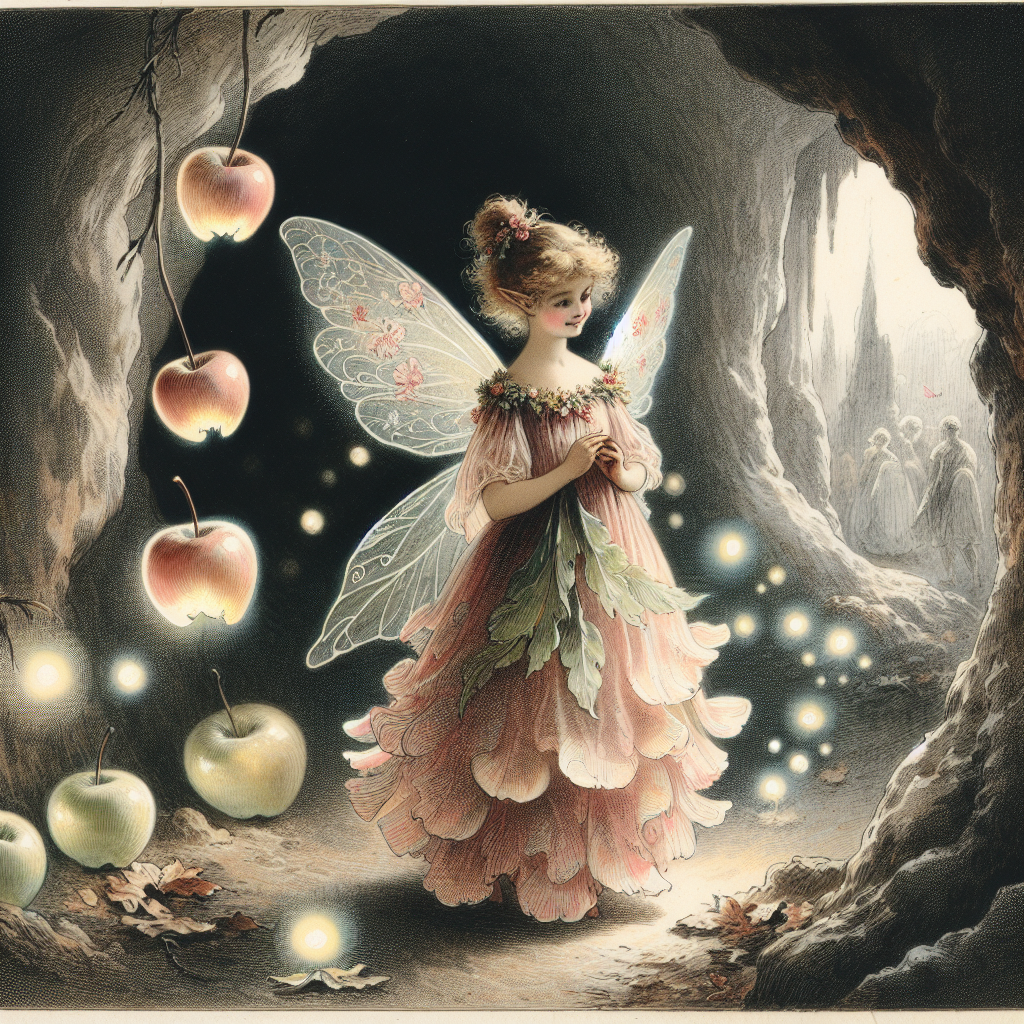 Il était une fois, dans une forêt enchantée, une petite fée appelée Florette. Elle aimait explorer les merveilles de la nature et découvrir de nouveaux secrets. Un jour, en se promenant, Florette aperçoit une grotte cachée derrière un rideau de lianes vertes. Curieuse, elle entre doucement et découvre un spectacle éblouissant : des pommes qui brillent de mille feux tapissent les murs de la grotte.