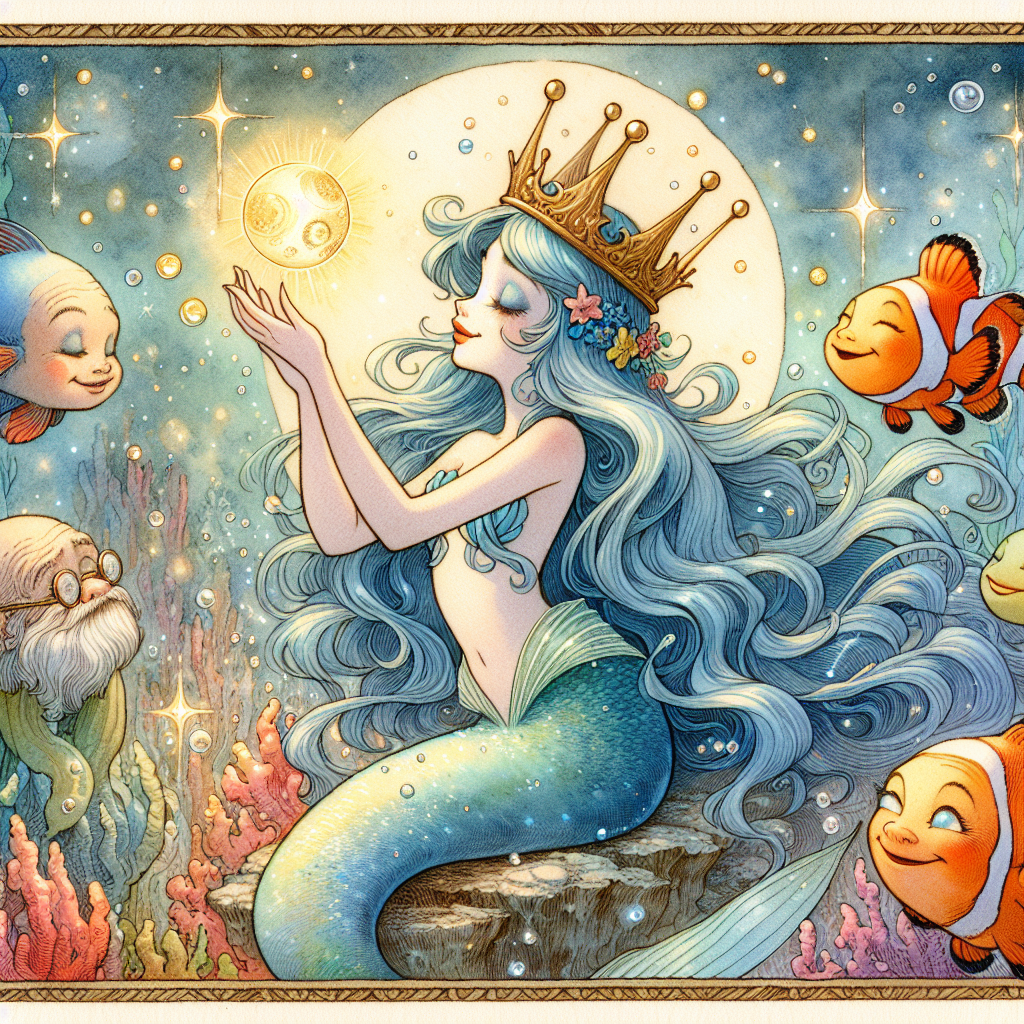 Arrivée chez elle, Luna posa la couronne sur une étagère et observa ce qui se passait. Ses amis poissons, attirés par la lueur, se rassemblèrent autour d’elle. Un vieux poisson clown, nommé Oscar, s’approcha et dit : “Cette couronne appartient à l’ancien roi de l’océan, elle a le pouvoir de réaliser des vœux incroyables ! Mais il faut l’utiliser avec sagesse.”