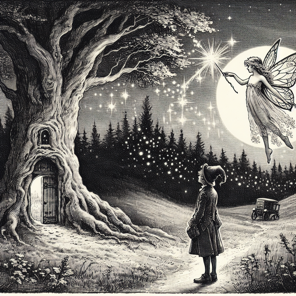 Louisette, sentant une magie particulière émaner de l’arbre, leva sa baguette avec un geste élégant. Une pluie d’étincelles dorées s’échappa, enveloppant l’arbre dans un doux halo de lumière. À cet instant, une porte cachée dans le tronc se révéla, scintillant doucement comme une promesse de découvertes merveilleuses. Le voyageur, émerveillé, échangea un regard complice avec Louisette. Ils savaient qu’ils étaient sur le point de découvrir quelque chose d’extraordinaire.