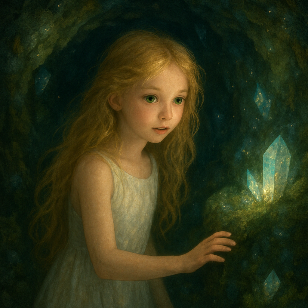 Dans cette antre enchantée, vivait une petite fille aux yeux brillants et aux cheveux tissés de soleil. Chaque jour, elle explorait les recoins sombres, découvrant les murmures de la pierre et le chant lointain des vents. Sa curiosité douce et son cœur léger l’emmenaient toujours plus loin, au-delà des ombres.