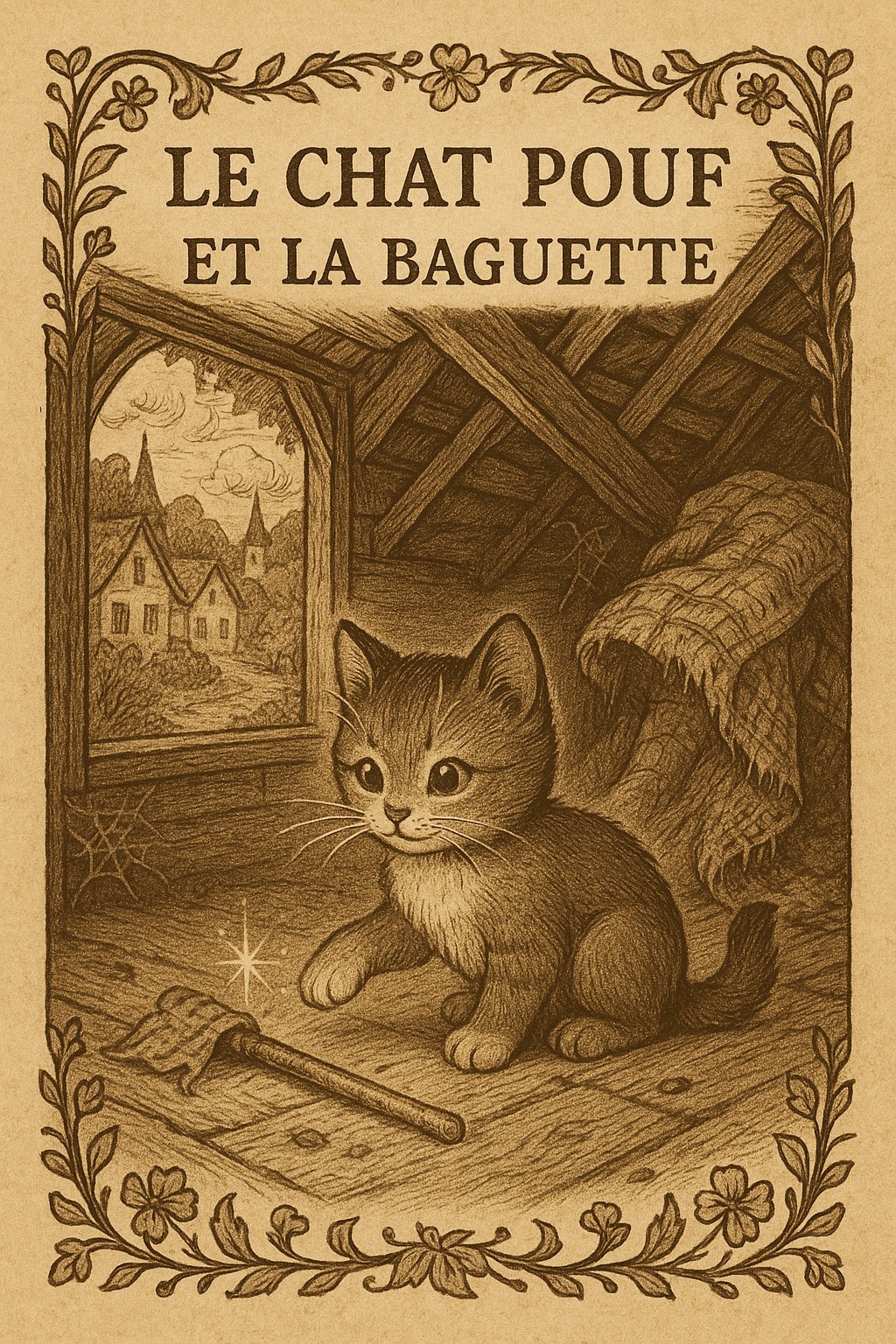 Chaque soir, le petit chat gris rentrait au grenier, déposait la baguette dans son coin, et s’endormait paisiblement contre les vieux tissus. Car il savait qu’au matin, une nouvelle aventure l’attendrait.
