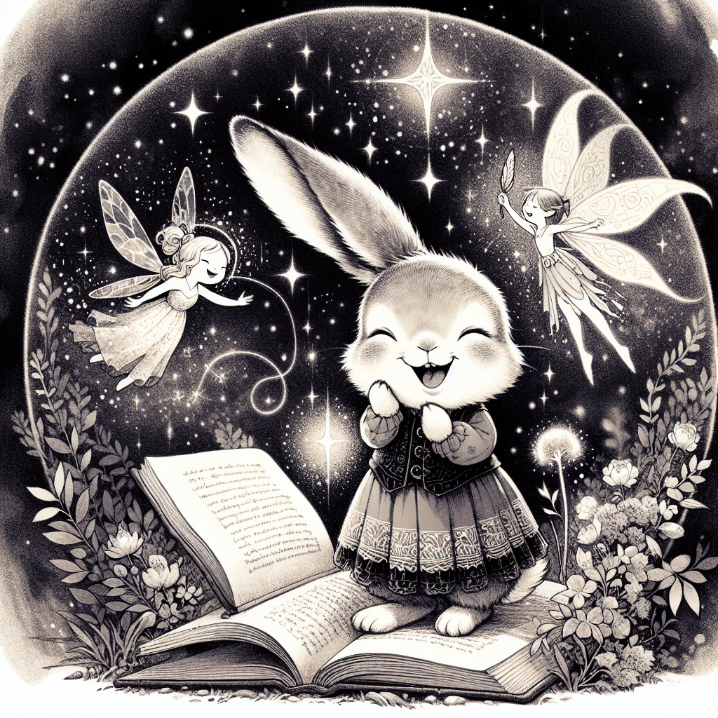La fée fit léviter le livre et le posa délicatement devant l’enchanteur. Le lutin, souriant, ouvrit les pages dorées, révélant les contes oubliés. Tandis que l’enchanteur lisait, les histoires magiques et lumineuses semblaient dissiper les ombres de son cœur. Ses yeux s’illuminèrent, et un sourire sincère apparut sur son visage, comme une étoile renaissante.