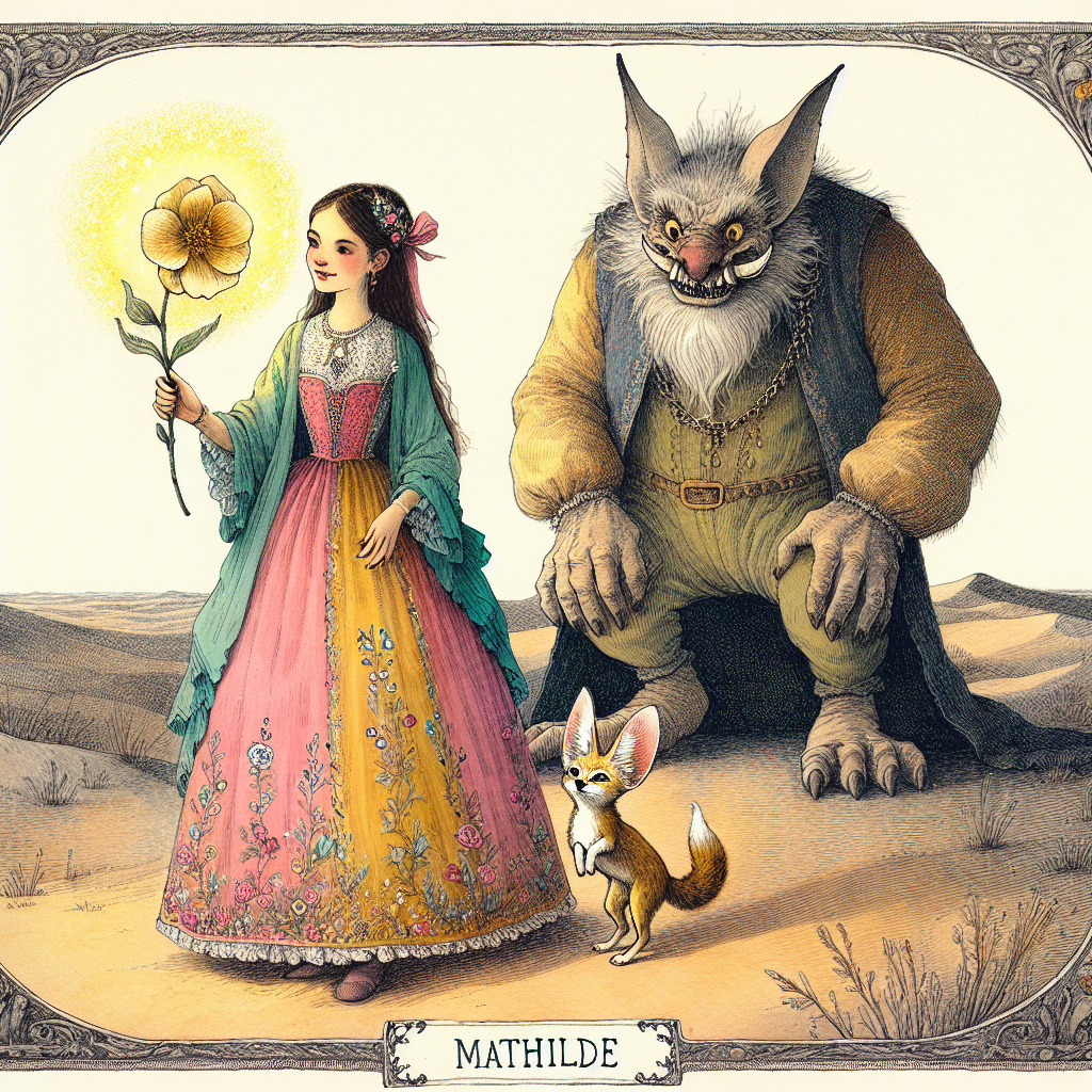 L’ogre, touché par sa gentillesse et son courage, sourit et révéla que le véritable secret du désert n’était pas la possession de trésors, mais la richesse de l’esprit et du cœur. Il expliqua à Mathilde que ceux qui savent partager et donner sans attendre en retour sont les plus riches de tous. En signe d’amitié, l’ogre offrit à Mathilde et au fennec une fleur magique, symbole de leur rencontre.