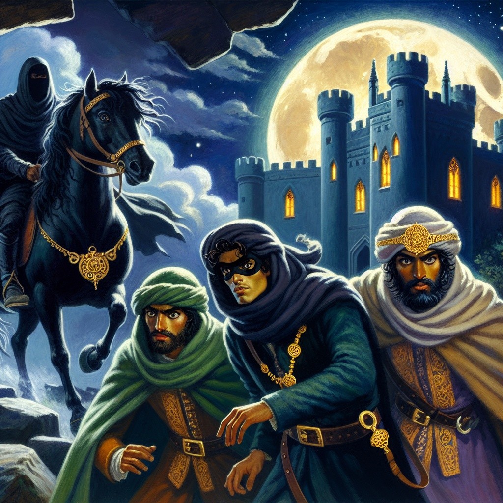 Ils remercièrent tous le Seigneur à genoux, et le Voleur Noir lui expliqua la raison pour laquelle ils avaient tenté de voler le Destrier de Cloches, et la nécessité dans laquelle ils se trouvaient de rentrer chez eux.